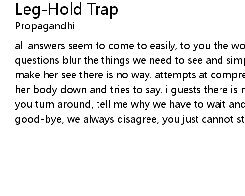 | all answers seem to come to easily, to you the word rhetorical is wrong. these questions blur the things we need to see and simplicity beneath a song i try to make her see there is no way. attempts at comprehension always miss. she lays her body down and tries to say. i guests there is no answer to a kiss so then you turn around, tell me why we have to wait and see. turn around and you sigh good-bye, we always disagree, you just cannot stand to see me free to fly away. |