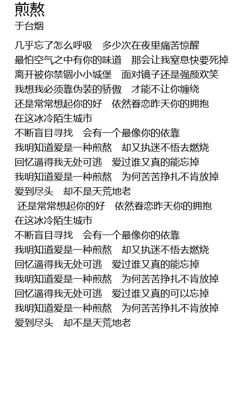 | [03:34.87] | 我明知道爱是一种煎熬 为何苦苦挣扎不肯放掉 |