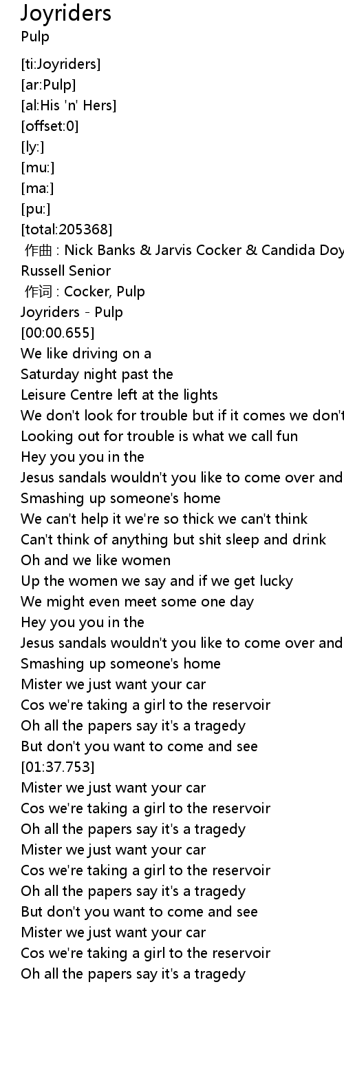 | [00:00.01] | 作词 : Cocker, Pulp |