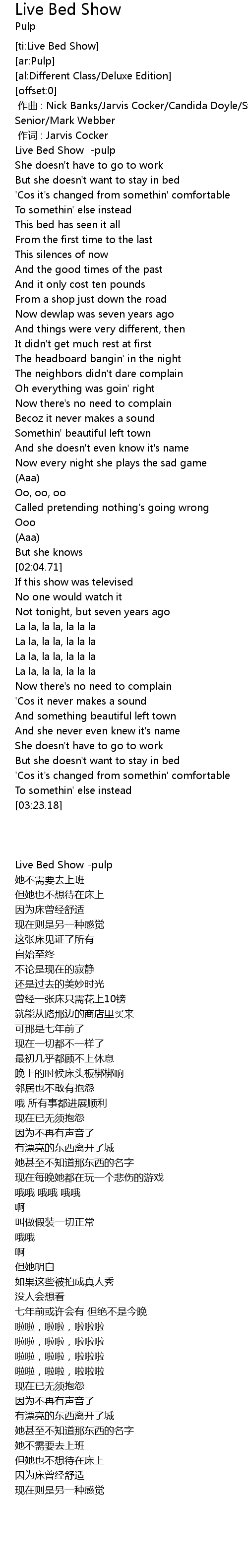 | [00:00.00] | zuo qu : Nick Banks Jarvis Cocker Candida Doyle Steve Mackey Russell Senior Mark Webber |