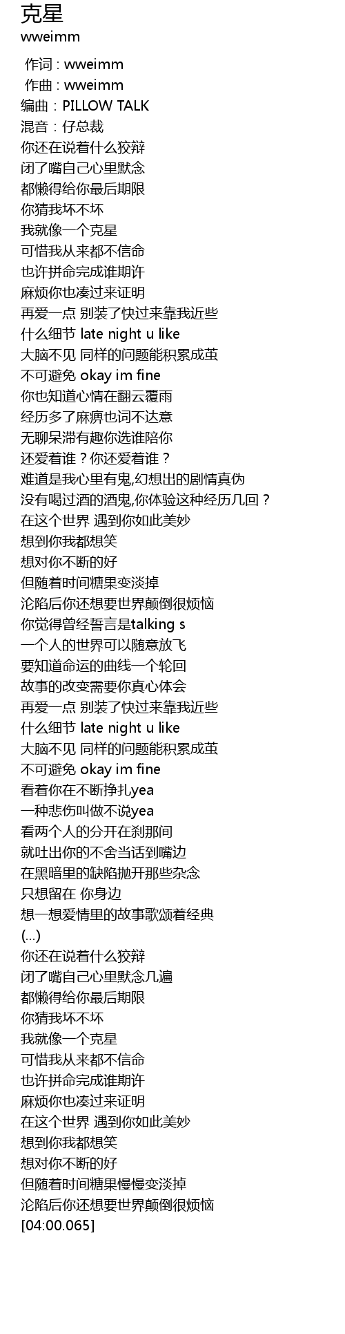 | [00:55.738] | shen me xi jie late night u like |