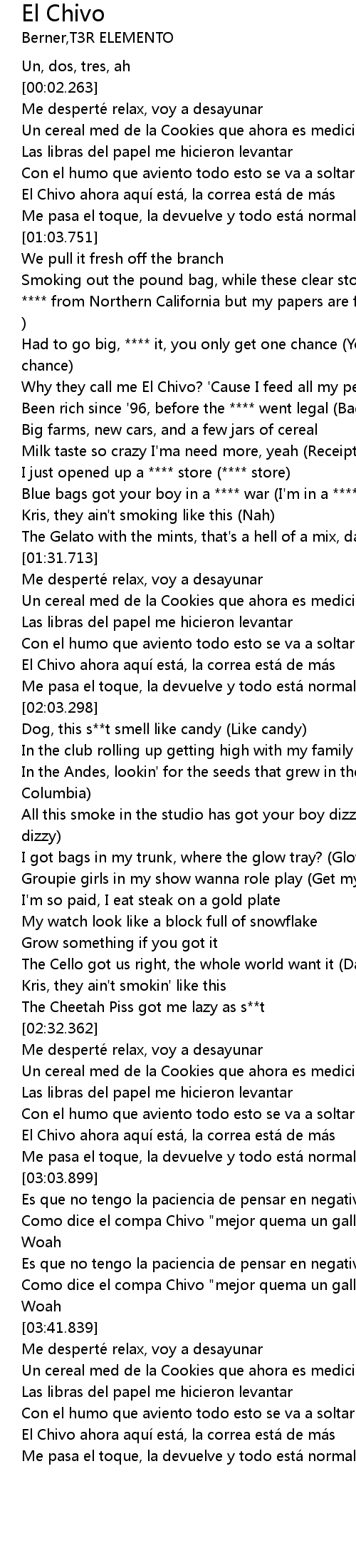 | [01:12.971] | Why they call me El Chivo? ' Cause I feed all my people El Chivo |