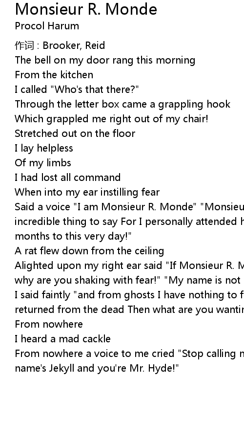 | From nowhere a voice to me cried " Stop calling me Monsieur R. Monde you fool! My name' s Jekyll and you' re Mr. Hyde!" |