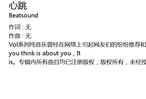 | Vol系列纯音乐曾经在网络上引起网友们的纷纷推荐和好评,这一次Beatsound又将这张珍藏多年的《Vol.4》发布至此,If you think is about you,It is。专辑内所有曲目均已注册版权,版权所有,未经授权禁止使用,如有使用需求请联系本人。 |
