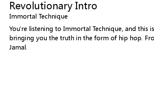 | You're listening to Immortal Technique, and this is Revolutionary Vol. 2: bringing you the truth in the form of hip hop. From Death Row, this is Mumia Abu Jamal. |