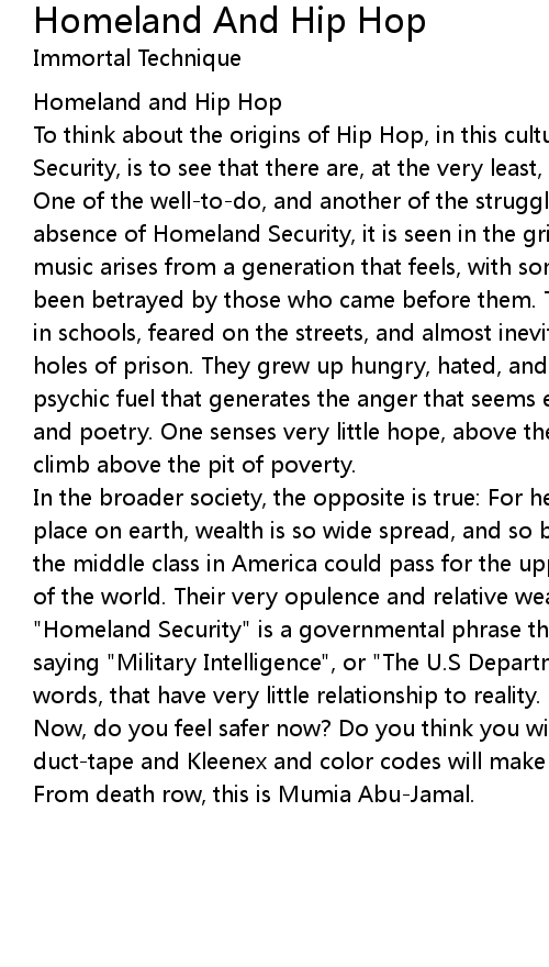 To think about the origins of Hip Hop, in this culture, and also about Homeland Security, is to see that there are, at the very least, two worlds in America: One of the well-to-do, and another of the struggling. For if ever there was the absence of Homeland Security, it is seen in the gritty roots of Hip Hop. For the music arises from a generation that feels, with some justice, that they have been betrayed by those who came before them. That they are, at best, tolerated in schools, feared on the streets, and almost inevitably destined for the hell holes of prison. They grew up hungry, hated, and unloved, and this is the psychic fuel that generates the anger that seems endemic in much of the music and poetry. One senses very little hope, above the personal goals of wealth, to climb above the pit of poverty. |