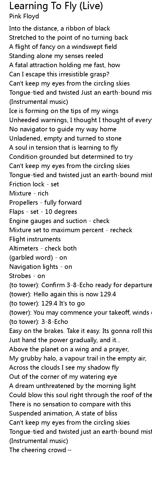 | [01:19.800] | Ice is forming on the tips of my wings |