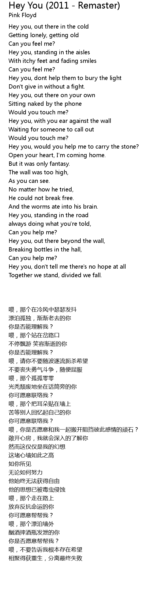| [00:56.100] | Hey you, dont help them to bury the light |