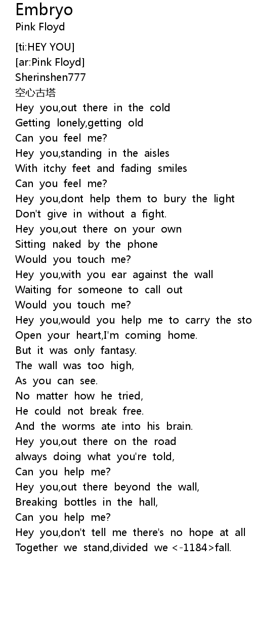 | [00:56.13] | Hey you, dont help them to bury the light |