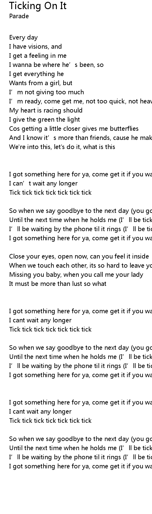 | So when we say goodbye to the next day (you got me ticking on it) | |
