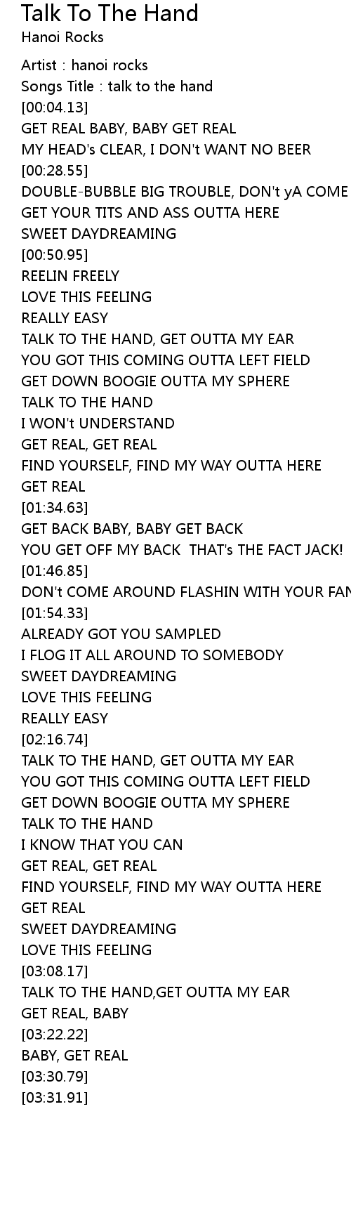 | [03:18.35] | TALK TO THE HAND,GET OUTTA MY EAR |