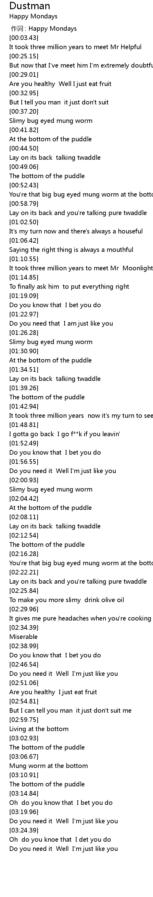 | [00:54.99] | You're that big bug eyed mung worm at the bottom of the puddle |