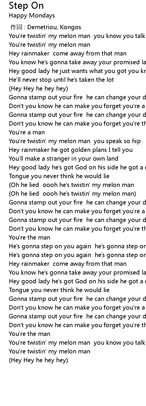 | [02:30.28] | He' s gonna step on you again he' s gonna step on you |