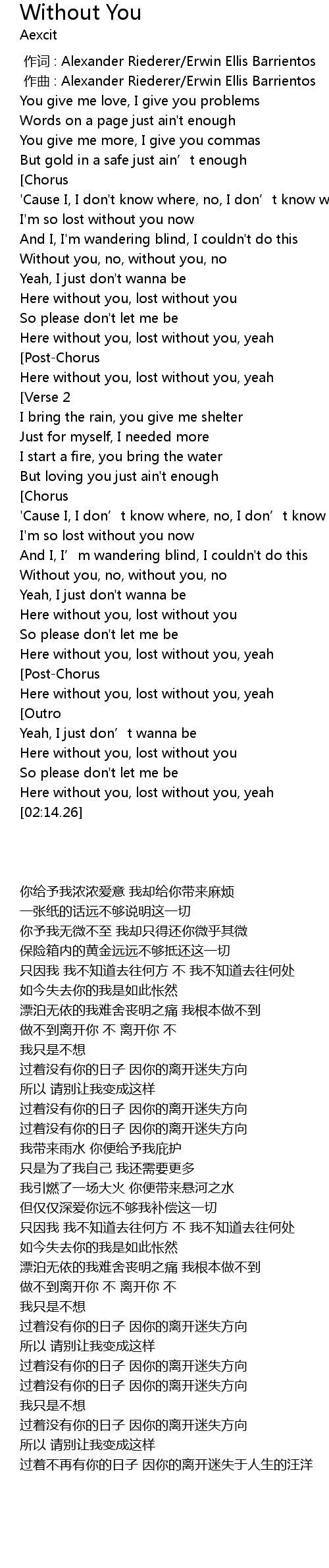 | [02:09.42] | Here without you, lost without you, yeah |