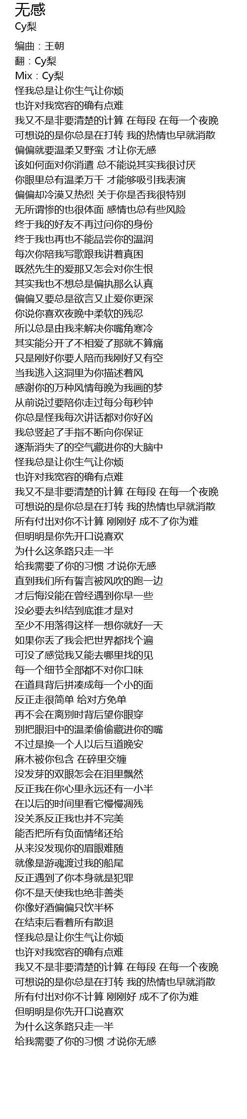 | [01:56.888] | gěi wǒ xū yào le nǐ de xí guàn cái shuō nǐ wú gǎn |