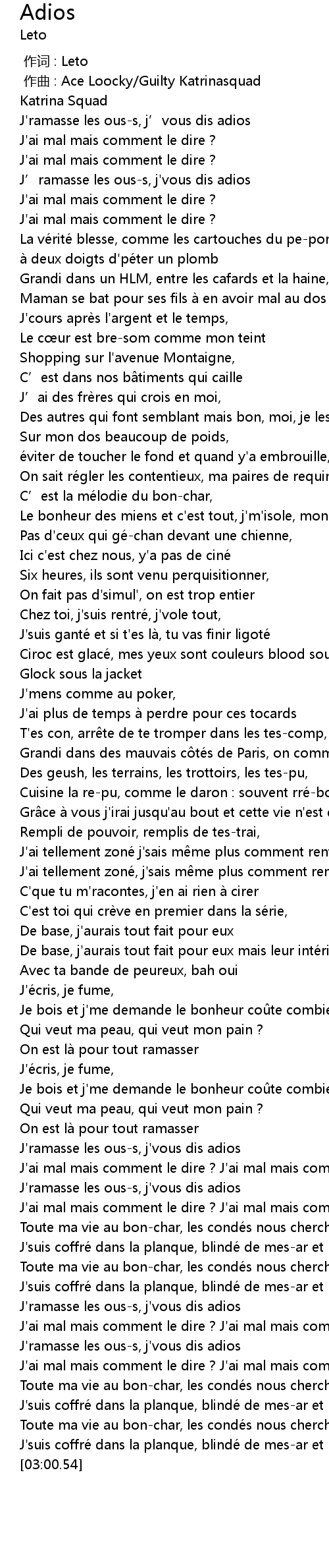 | [00:22.96] | J’ramasse les ous-s, j'vous dis adios |