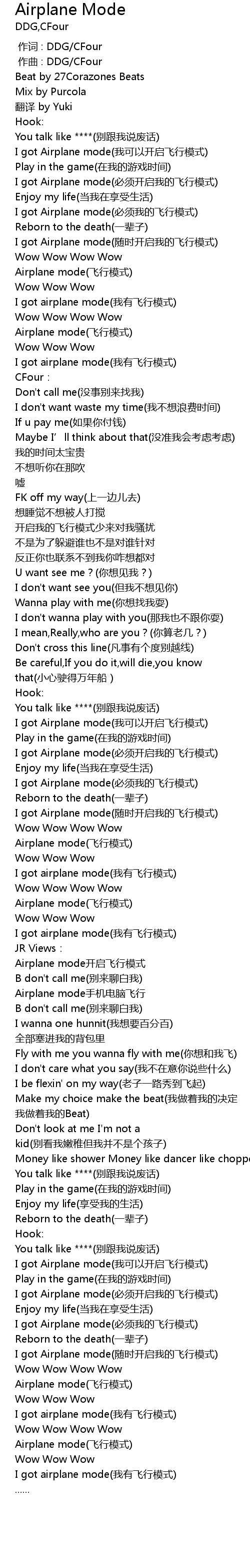 | [01:12.341] | I got Airplane mode bì xū wǒ de fēi xíng mó shì |