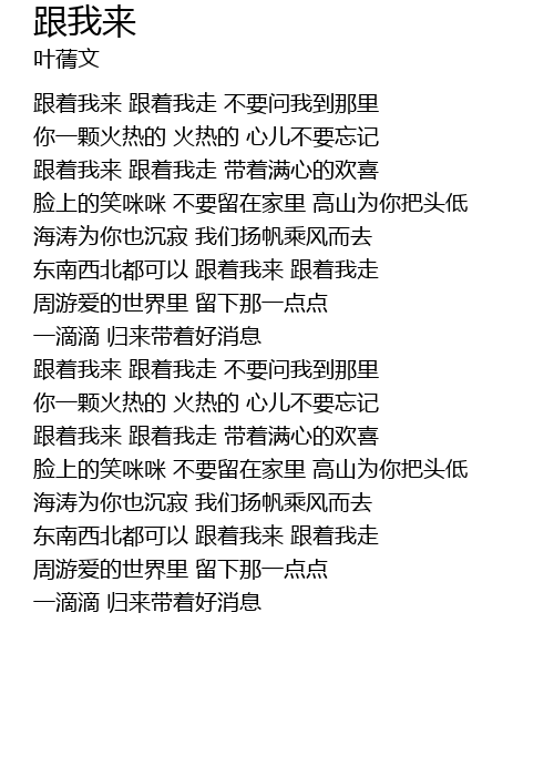 | [00:20.57] | 跟着我来 跟着我走 不要问我到那里 |
