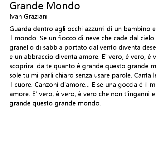| Guarda dentro agli occhi azzurri di un bambino e vedrai da te quanto e grande il mondo. Se un fiocco di neve che cade dal cielo diventa ghiacciaio se un granello di sabbia portato dal vento diventa deserto. E se una goccia e il mare e un abbraccio diventa amore. E' vero, e vero, e vero che non t' inganni e scoprirai da te quanto e grande questo grande mondo. Che giri sempre intorno al sole tu mi parli chiaro senza usare parole. Canta le tue canzoni fino a toccarmi il cuore. Canzoni d' amore... E se una goccia e il mare e un abbraccio diventa amore. E' vero, e vero, e vero che non t' inganni e scoprirai da te quanto e grande questo grande mondo. |