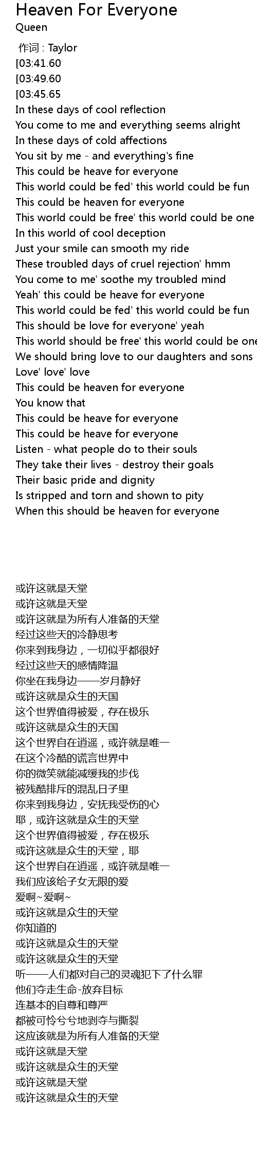 | [04:01.42][03:45.65][00:20.50] | This could be heaven for everyone |