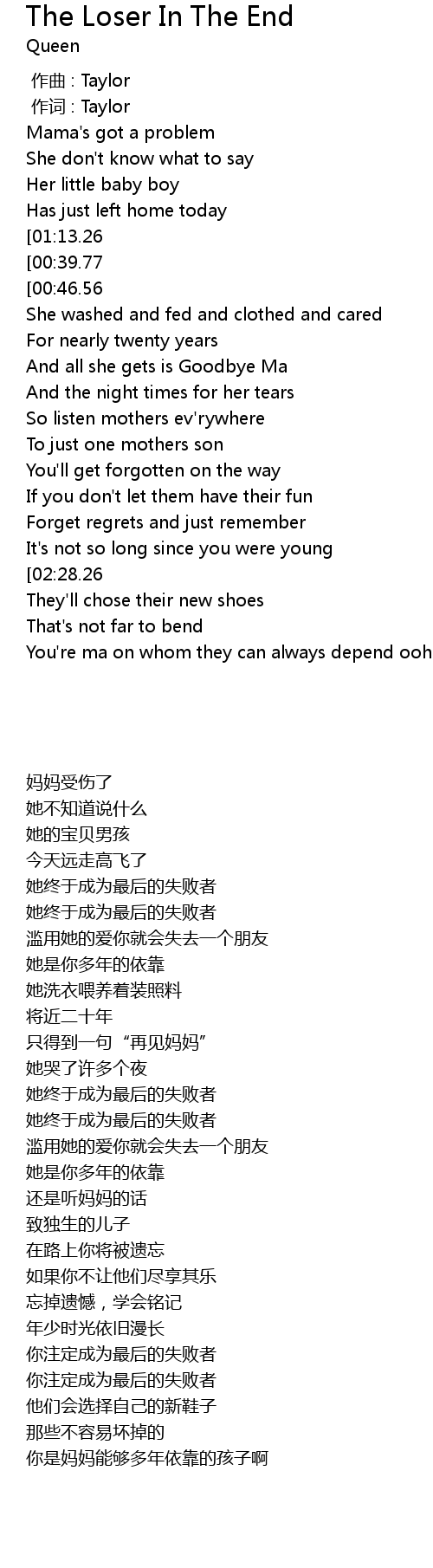 | [01:19.87][01:13.26][00:32.99][00:26.53] | She' s got to be the loser in the end |