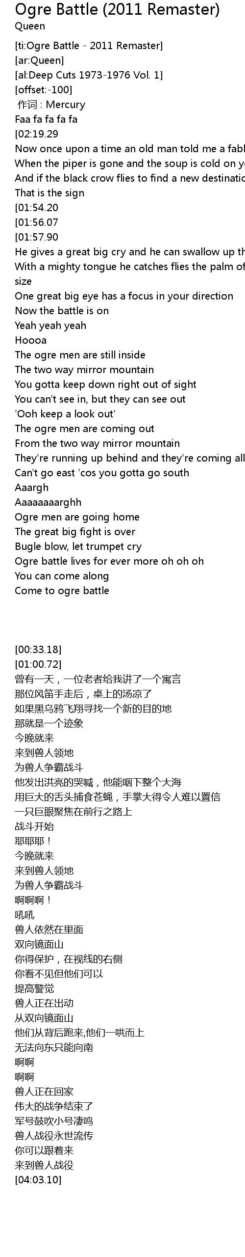 | [01:28.98][01:57.90] | Come to the ogre battle fight |
