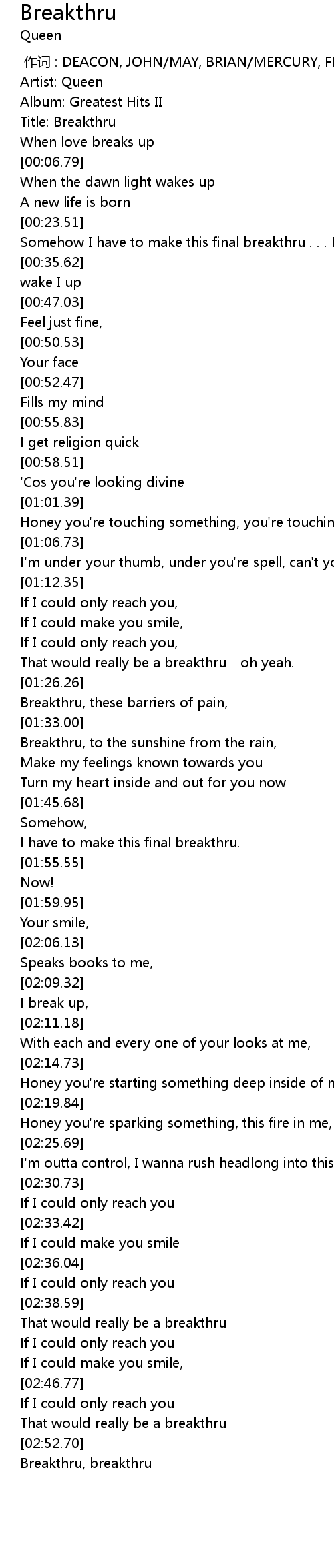 | [00:00.00] | 作词 : DEACON, JOHN/MAY, BRIAN/MERCURY, FREDDIE/TAYLOR, ROGER |