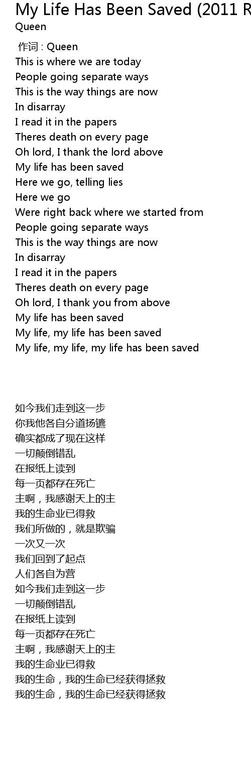 | Song | My Life Has Been Saved (2011 Remaster) |