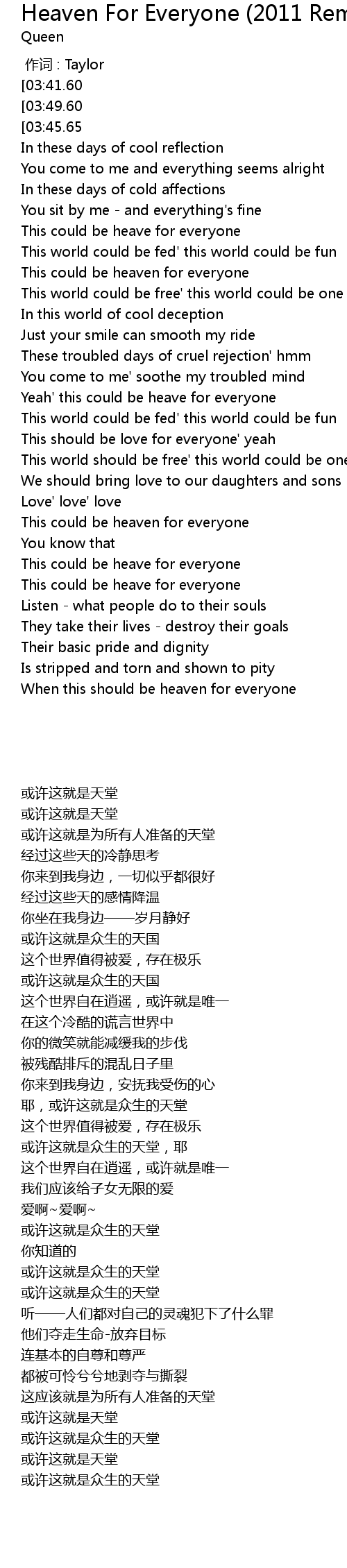 | [04:01.42][03:45.65][00:20.50] | This could be heaven for everyone |