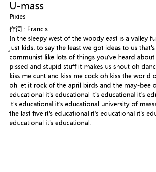 | In the sleepy west of the woody east is a valley full, full o' pioneer we' re not just kids, to say the least we got ideas to us that' s dear like capitalist, like communist like lots of things you' ve heard about and redneckers they get us pissed and stupid stuff it makes us shout oh dance with me oh don' t be shy oh kiss me cunt and kiss me cock oh kiss the world oh kiss the sky oh kiss my ass oh let it rock of the april birds and the maybee oh baby it' s educational it' s educational it' s educational it' s educational it' s educational it' s educational it' s educational it' s educational university of massachusetts, please and here' s the last five it' s educational it' s educational it' s educational it' s educational it' s educational. |