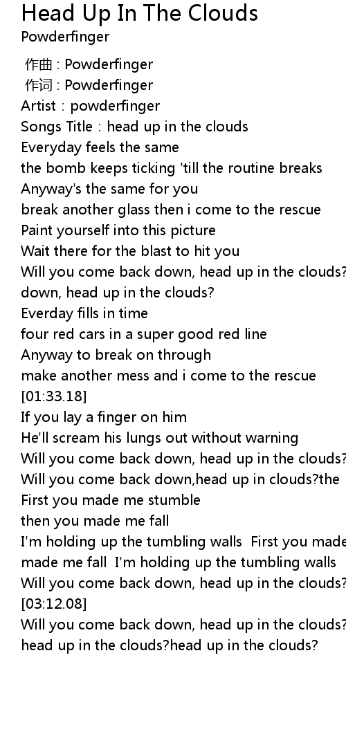 | [00:01.84] | Songs Title: head up in the clouds |