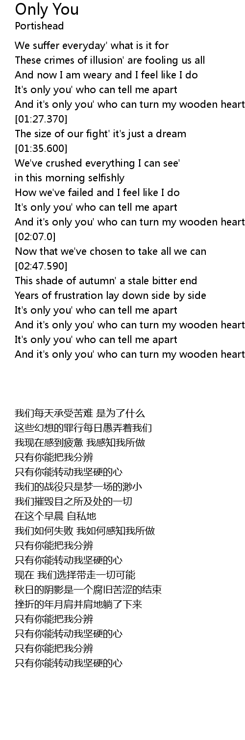 | [01:18.700] | And it' s only you' who can turn my wooden heart |