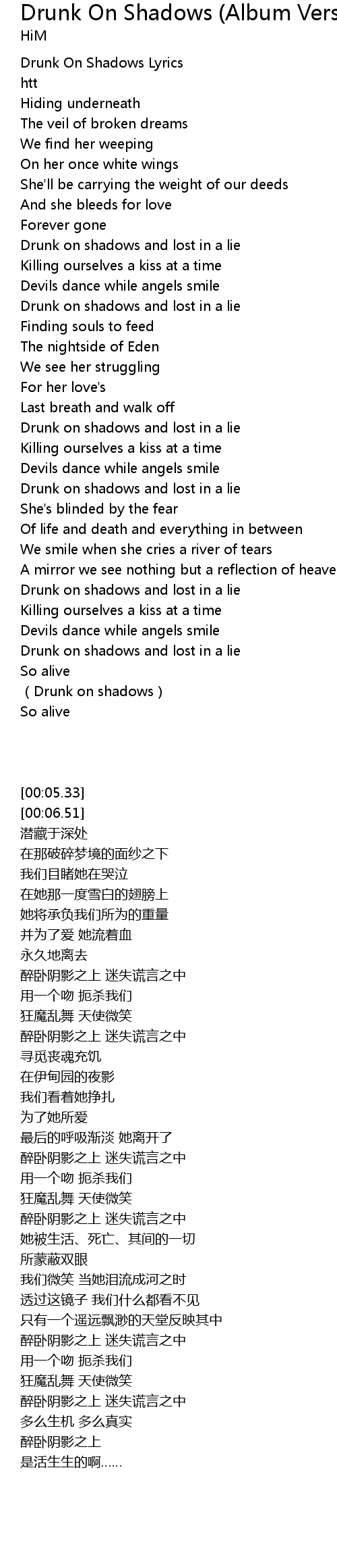 | [00:05.33] | Drunk On Shadows Lyrics |