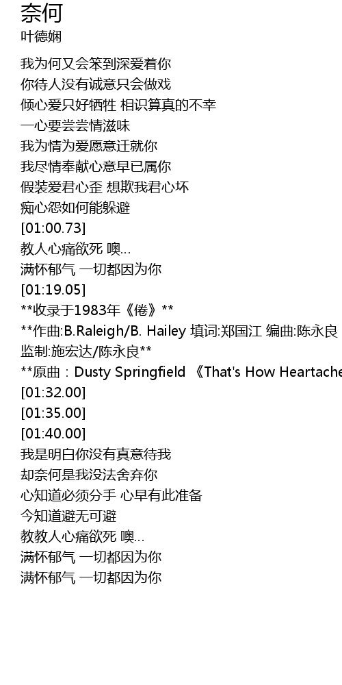 | [01:26.00] | **作曲:B.Raleigh/B. Hailey 填词:郑国江 编曲:陈永良 监制:施宏达/陈永良** |