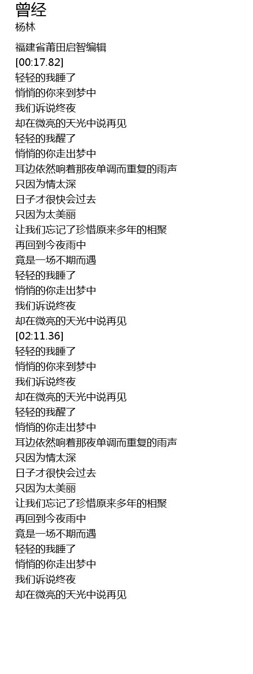| [03:21.16] | 耳边依然响着那夜单调而重复的雨声 |