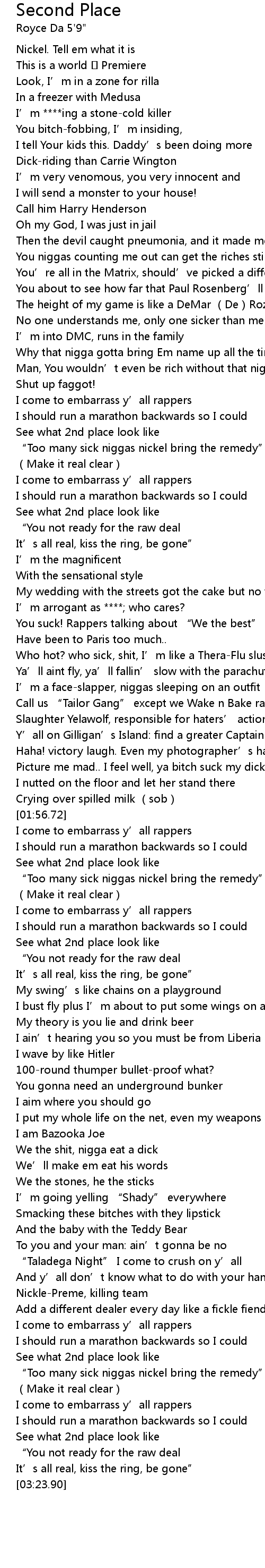 | [02:06.52] | “Too many sick niggas nickel bring the remedy” |