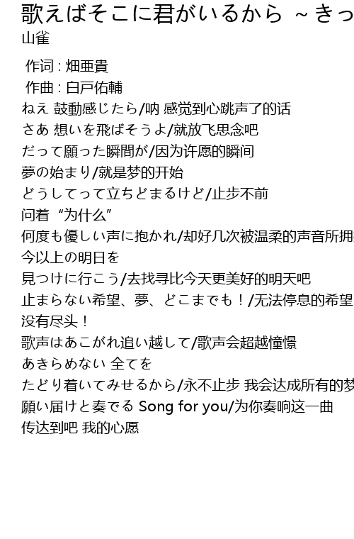 | [01:40.89] | 願い届けと奏でる Song for you/为你奏响这一曲 传达到吧 我的心愿 |