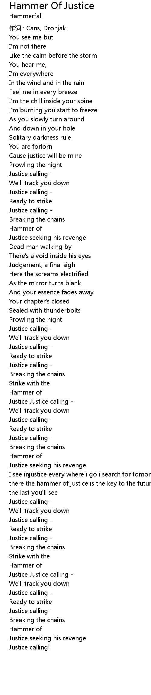 | I see injustice every where i go i search for tomorrow and i know you will be there the hammer of justice is the key to the future the bringer of sorrow is the last you' ll see | |