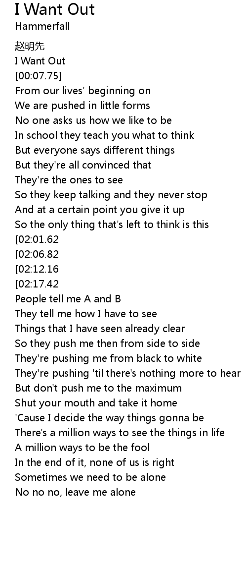 | [00:03.11] | I Want Out |