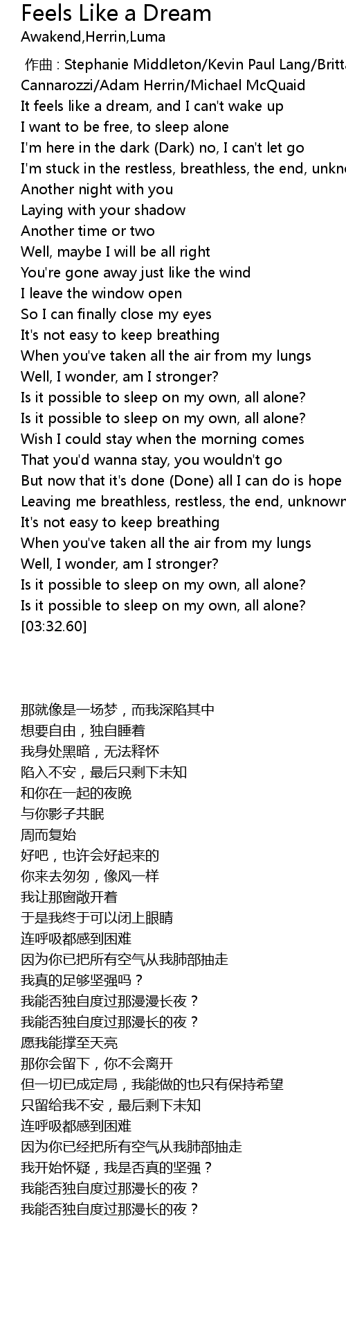 | [00:11.93] | It feels like a dream, and I can't wake up |