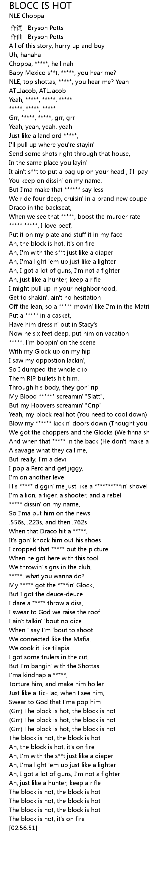 | [02:50.21] | The block is hot, the block is hot |