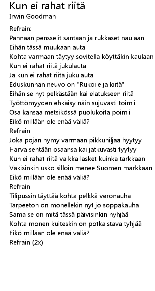 | Väkisinkin usko silloin menee Suomen markkaan | |