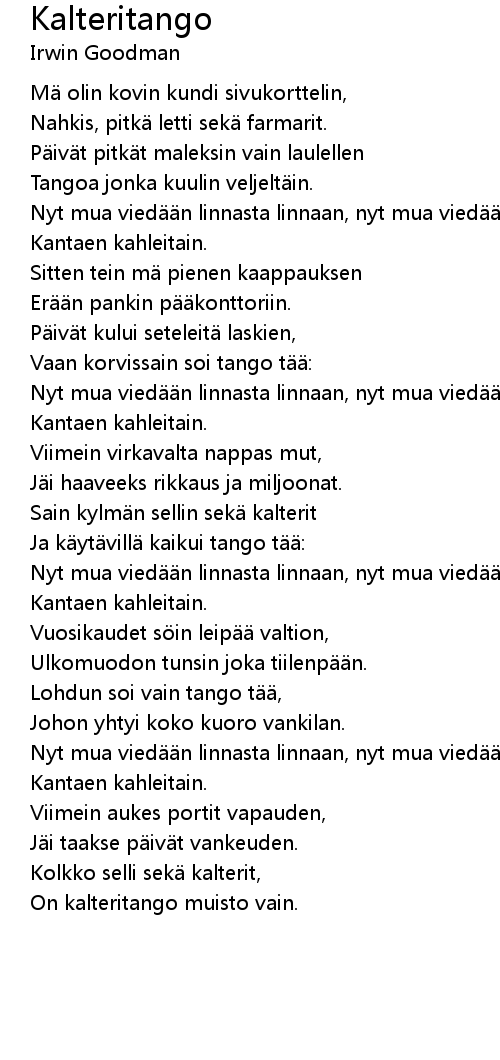 | Nyt mua vied n linnasta linnaan, nyt mua vied n linnasta linnaan... Kantaen kahleitain. | |