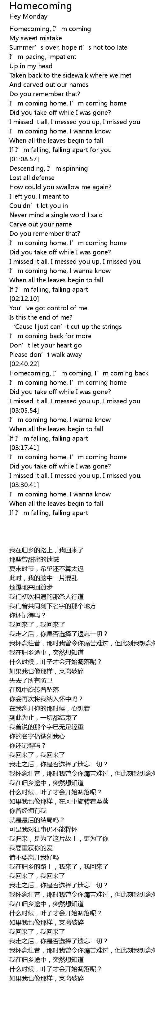 | [02:47.78] | Homecoming, I' m coming, I' m coming back |