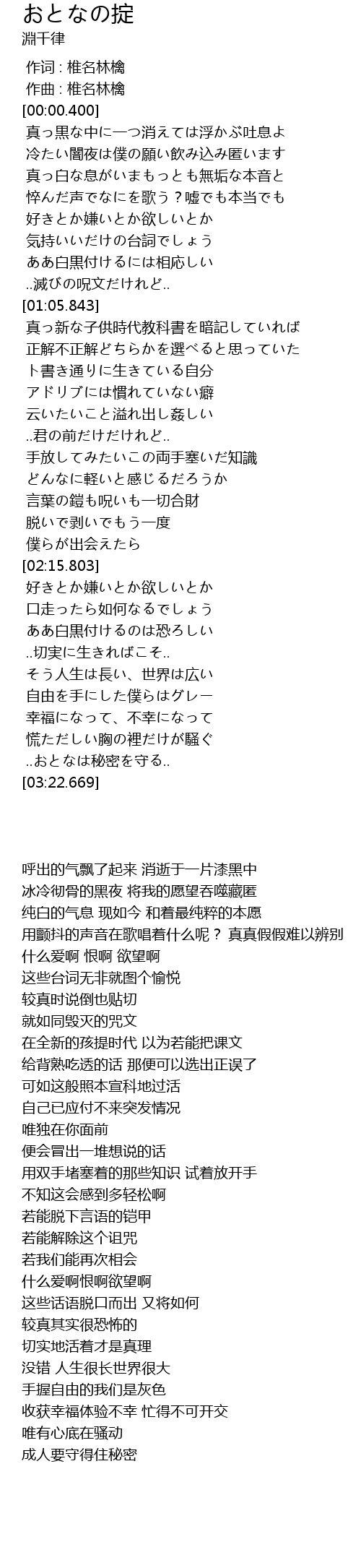 | [00:33.172] | 悴んだ声でなにを歌う?嘘でも本当でも |