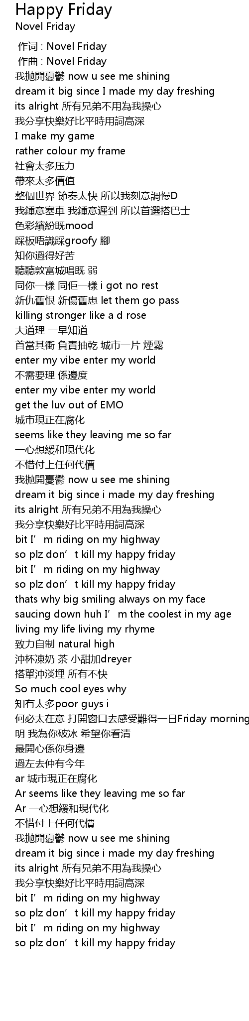 | [02:20.00]何必太在意 打開窗口去感受難得一日Friday morning 痛苦是過程 冇人明我[02:25.00] | ming wo wei ni po bing xi wang ni kan qing |