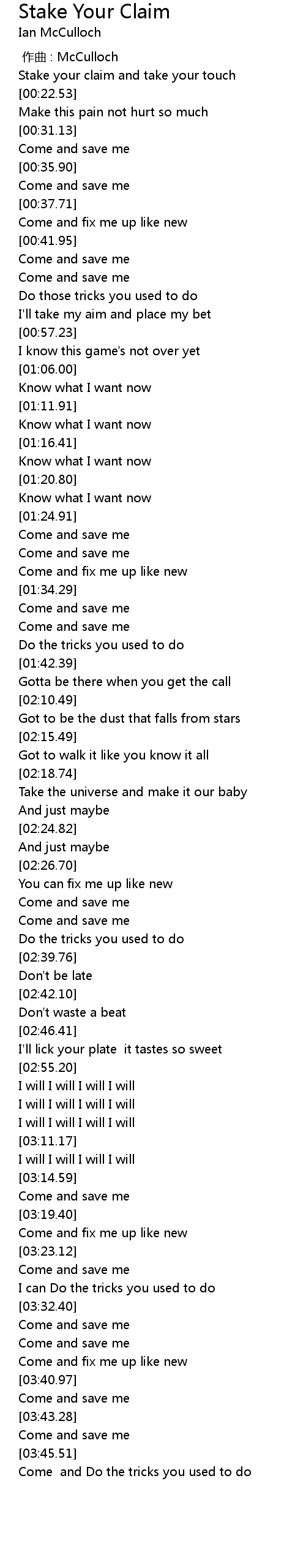 | [00:16.54] | Stake your claim and take your touch |