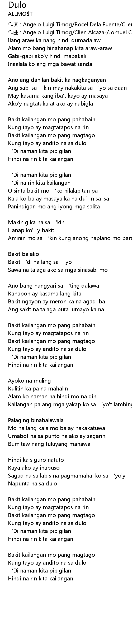 | 作词 : Angelo Luigi Timog/Rocel Dela Fuente/Clien Alcazar/Jomuel Casem | |