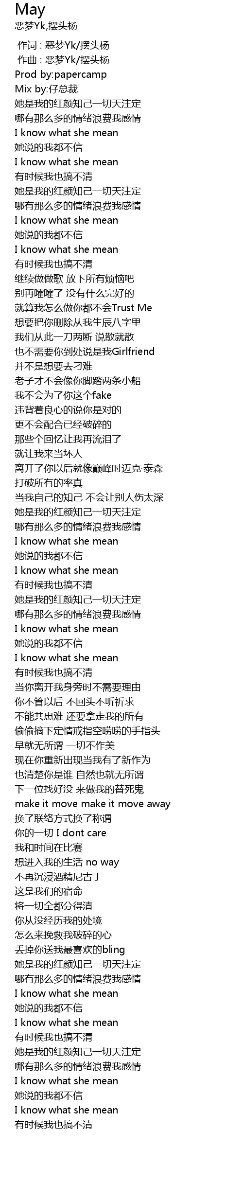 | [00:00.000] | 作词 : 恶梦Yk/摆头杨 |