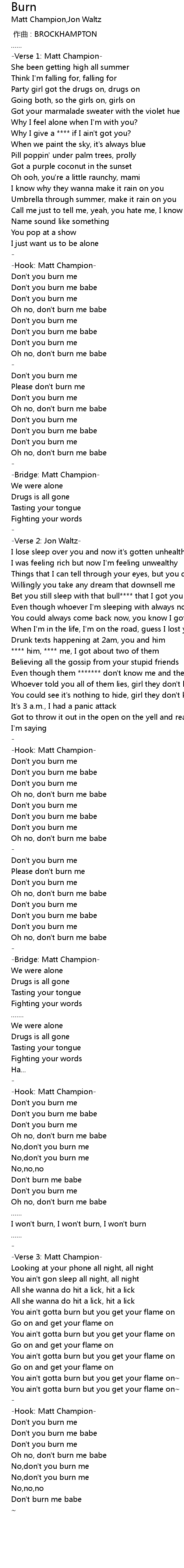 | [02:00.959] | Oh no, don' t burn me babe |